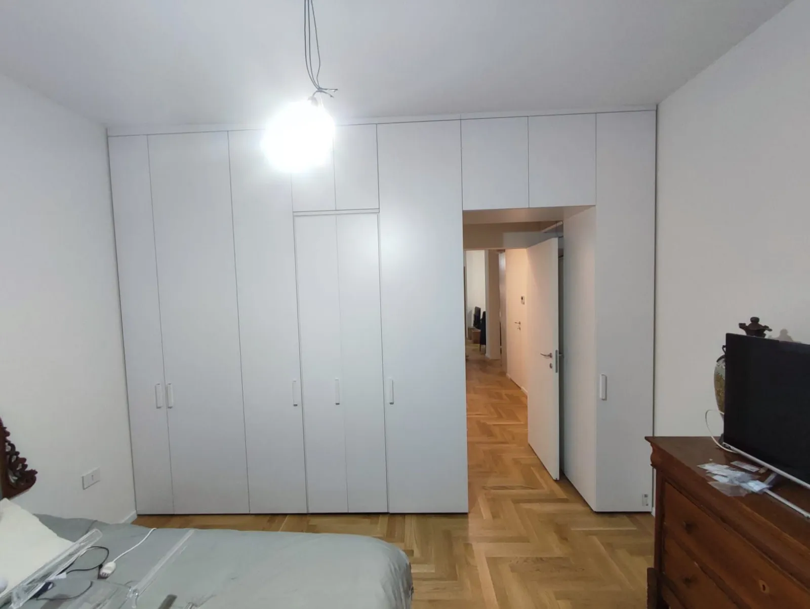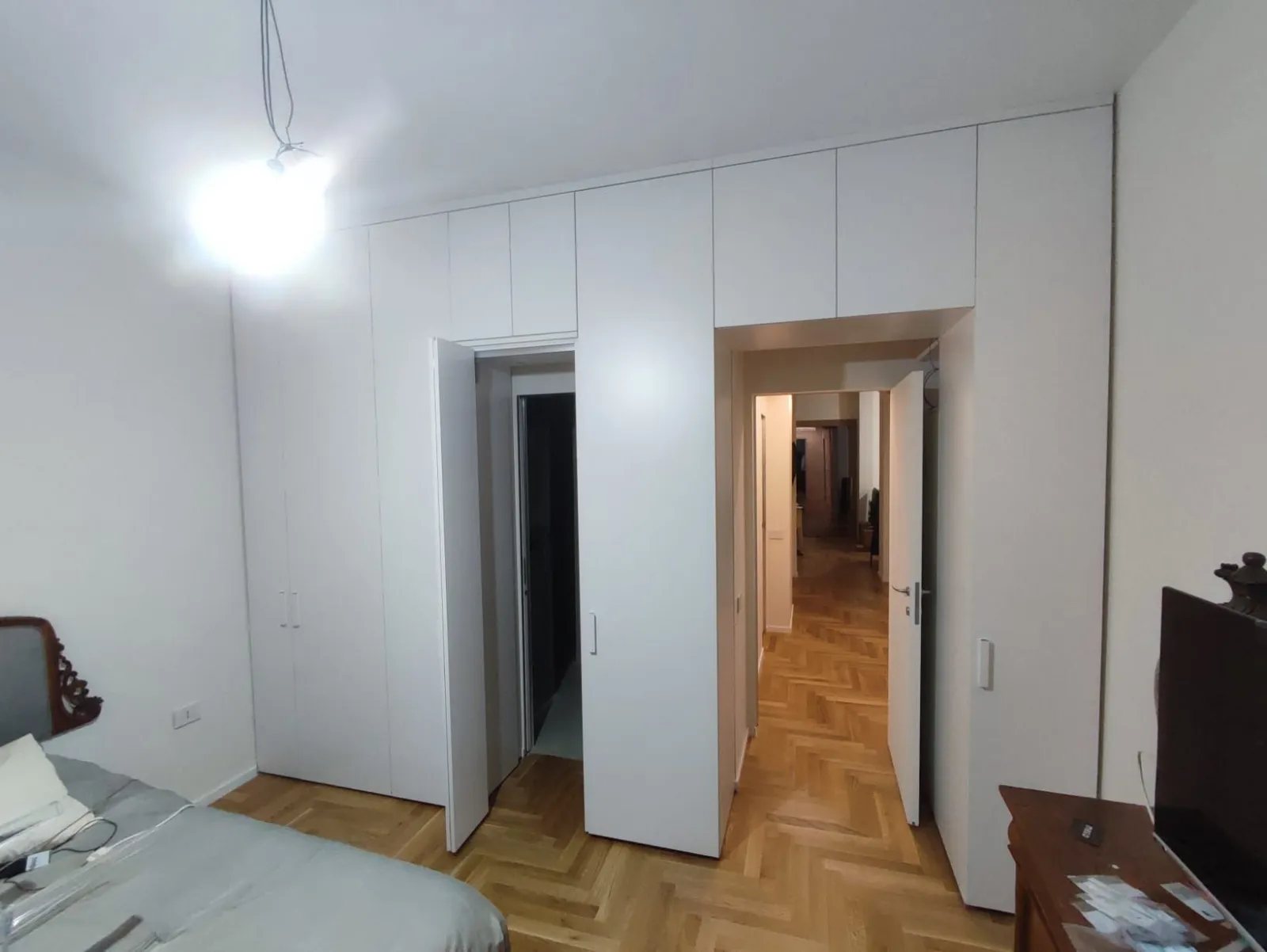 Nelle zone notte romane, dove ogni metro è prezioso, la struttura a ponte sopra le porte rappresenta la massima espressione di efficienza. Come visibile negli scatti, l'armadiatura prosegue ininterrotta sopra l'architrave, creando ampi vani di stivaggio per il cambio stagione o per oggetti ingombranti. Questa continuità visiva elimina le frammentazioni estetiche tipiche degli arredi standard. L’integrazione millimetrica con il soffitto non solo previene l’accumulo di polvere, ma slancia verticalmente l’ambiente, trasformando una semplice parete in una facciata architettonica funzionale e armoniosa.
