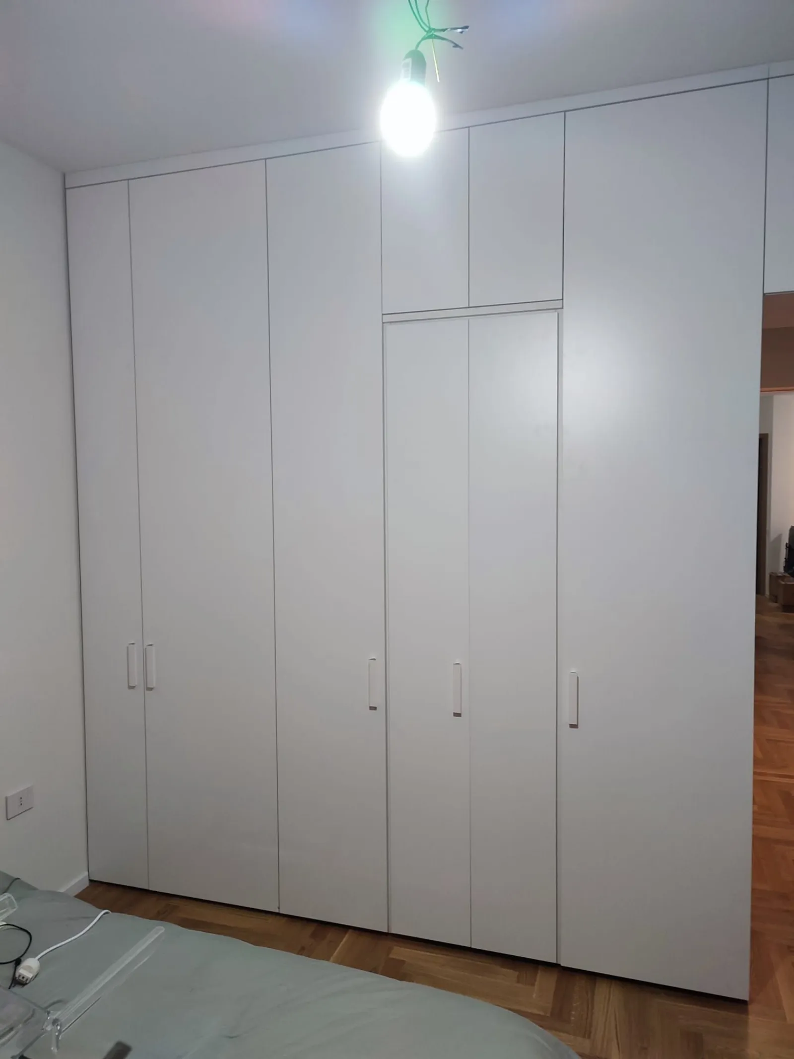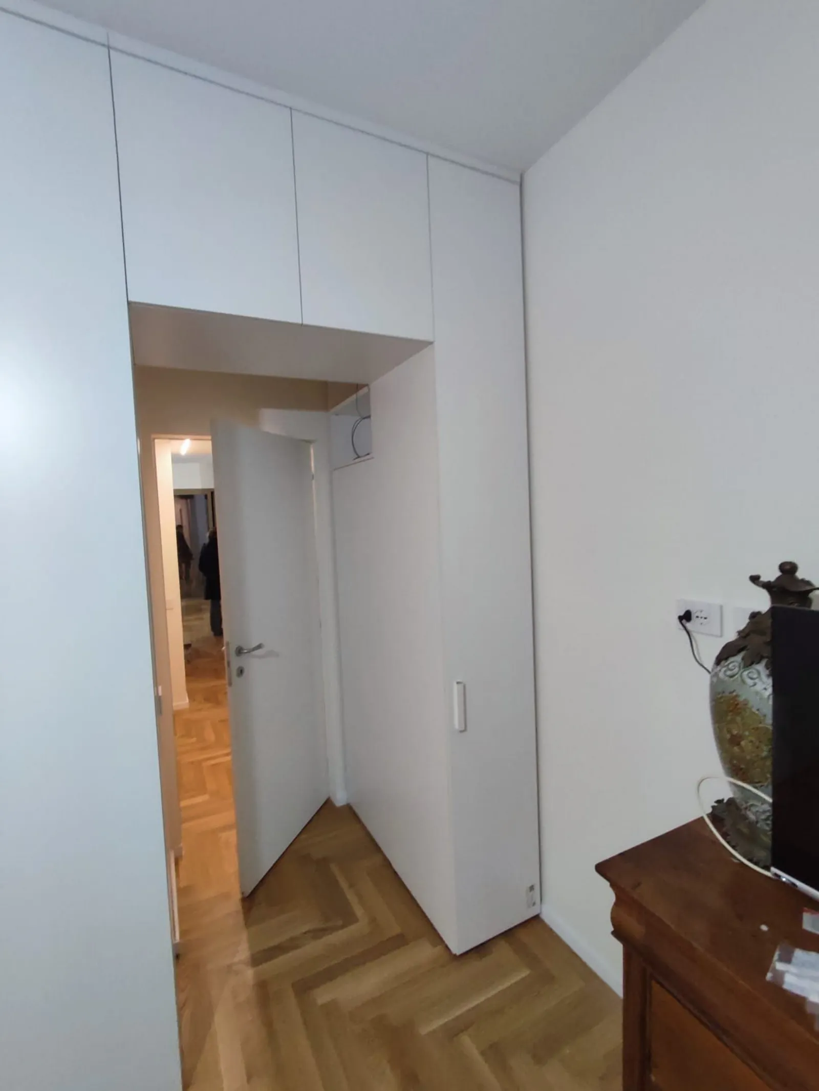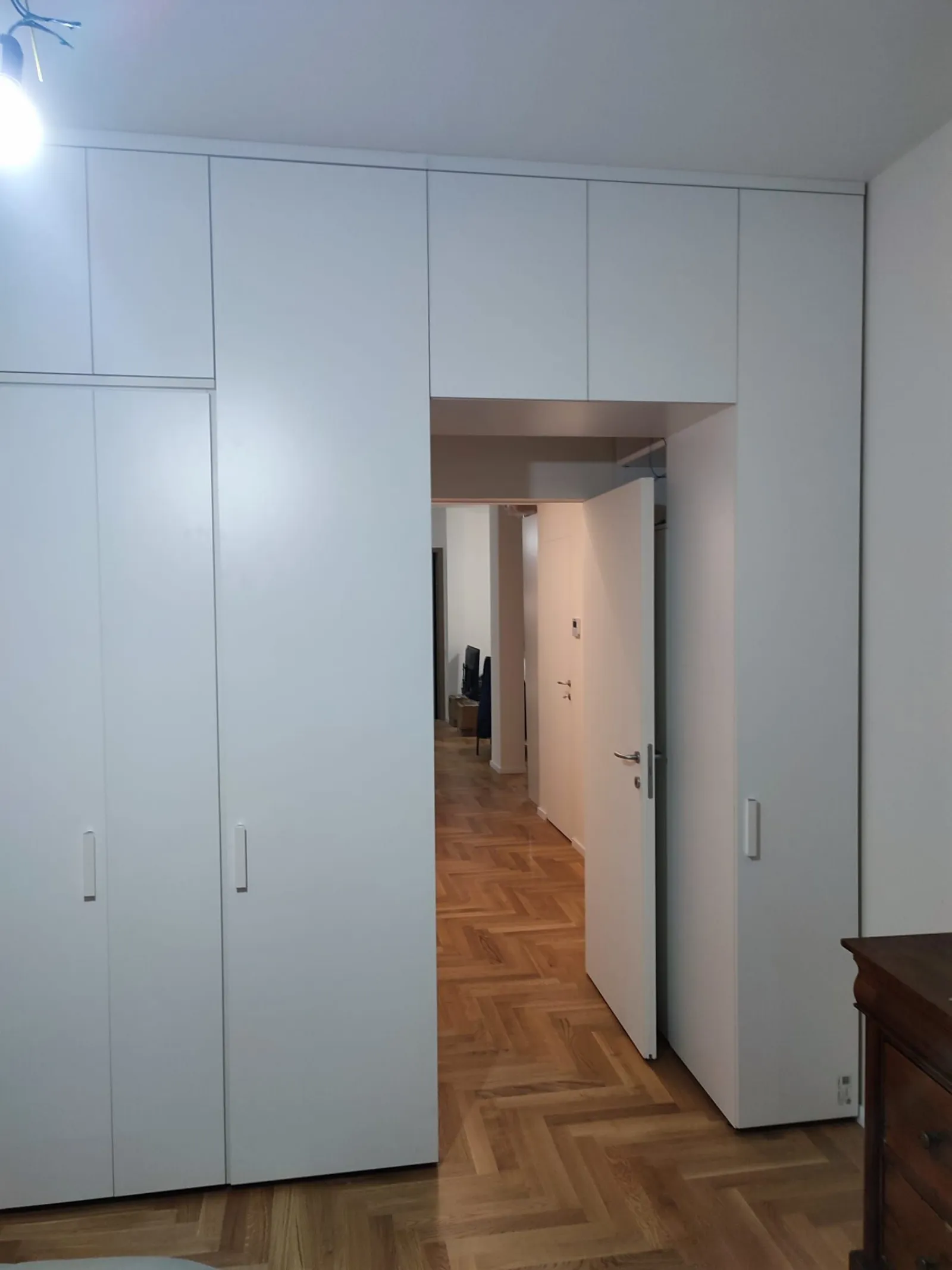 La scelta cromatica del bianco neve e la disposizione simmetrica delle ante sono studiate per dialogare con il pavimento in parquet a spina di pesce. In un contesto di arredo su misura, il dettaglio della maniglia verticale coordinata sottolinea la linearità della composizione. Le ante a battente garantiscono una chiusura ermetica e una pulizia formale impeccabile. Ogni modulo è stato progettato per rispondere a esigenze specifiche: vani appendiabiti, cassettiere interne e ripiani ad alto carico, tutto celato dietro un’estetica minimalista che non appesantisce il campo visivo dell'utente.