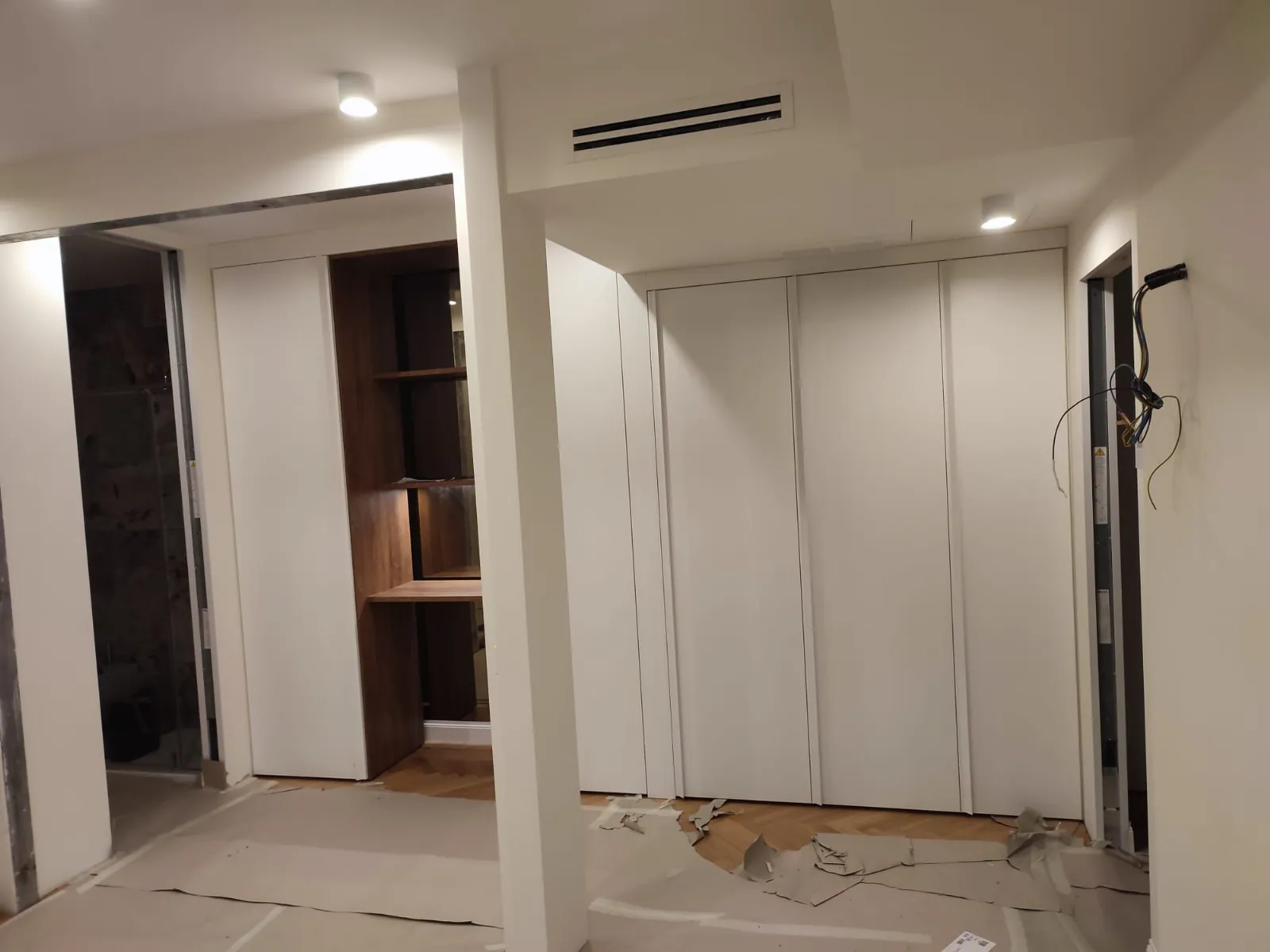 Il dinamismo della struttura si esprime nella parte terminale, dove l'altezza dell'armadio diminuisce seguendo la linea ribassata del controsoffitto che ospita le bocchette dell'aria condizionata. Questo raccordo sartoriale evita antiestetici spazi vuoti o accumuli di polvere, creando una fusione perfetta tra arredo e architettura. Le ante finali sono state configurate come scarpiera verticale ad alta capacità, sfruttando la profondità ridotta per organizzare calzature in modo ordinato e facilmente accessibile. Questo dettaglio conclude il percorso funzionale dell'armadio, dimostrando come la falegnameria su misura possa risolvere ogni esigenza di stoccaggio, trasformando ogni centimetro disponibile in valore aggiunto.