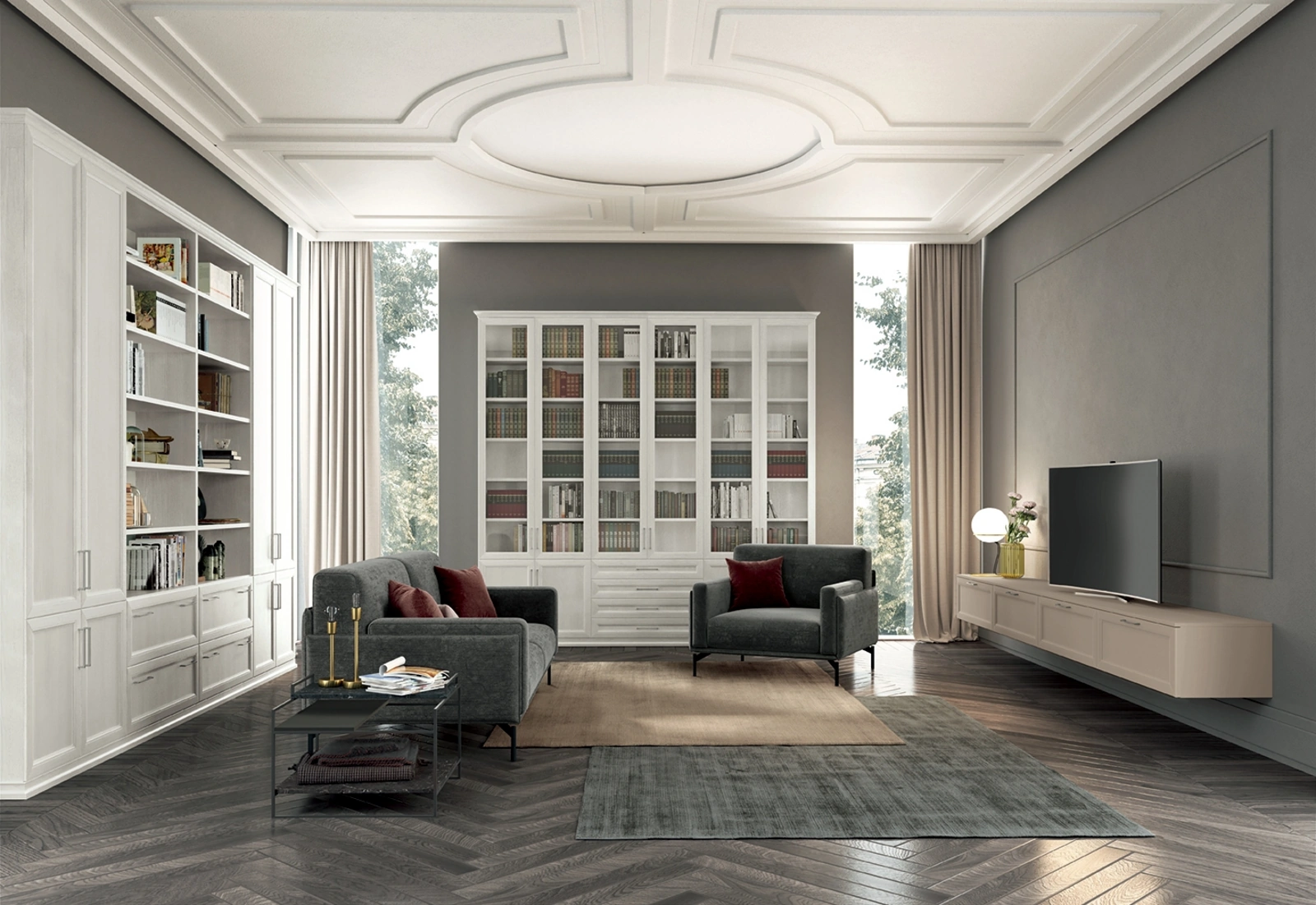 Finiture di pregio e forme decise: scopri la libreria Arcadia AS006 di Colombini Casa tra le più esclusive Librerie classiche a muro.