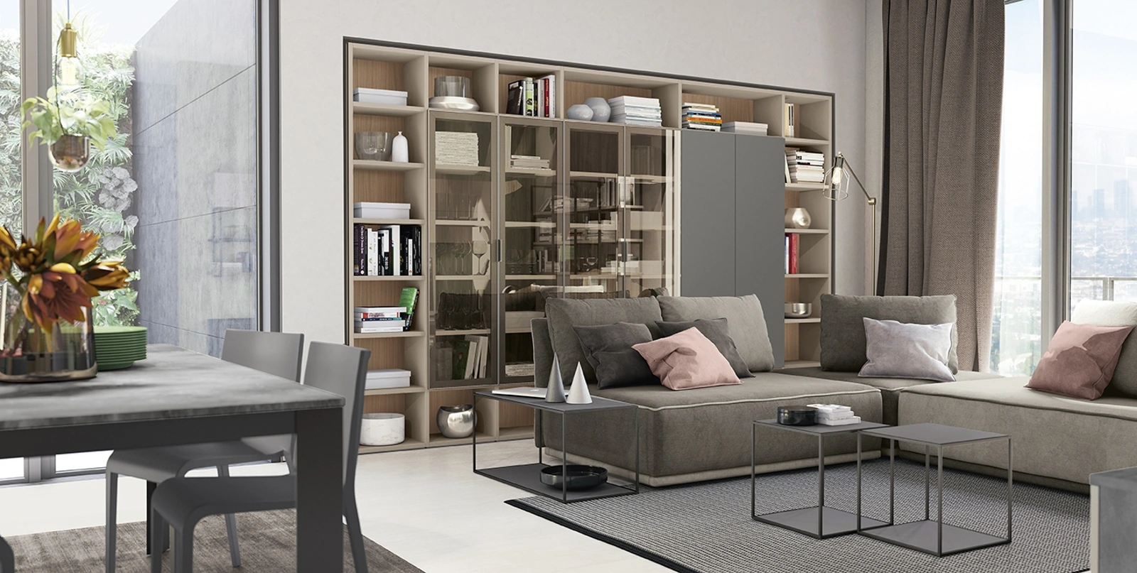 Texture di pregio e linee decise: scopri la libreria Golf Infinity A03 di Colombini Casa tra le più originali Librerie moderne a muro.