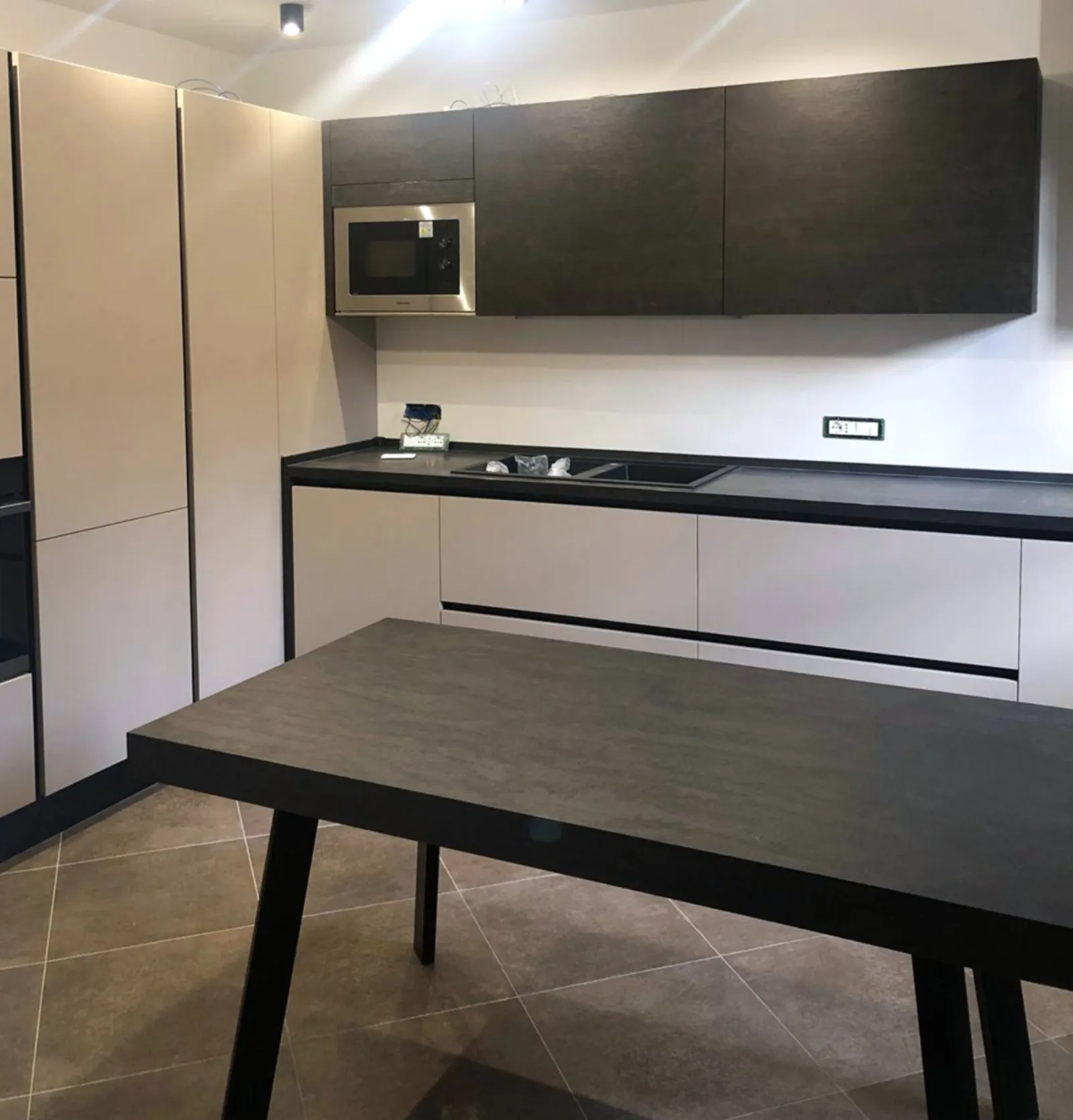 Il nuovo trend nella progettazione dei piani di lavoro è il lavello con vasca integrata, possibile grazie ai materiali innovativi e tecnologici dei moderni top, quali come in questo caso l'HPL sp. 18 mm.