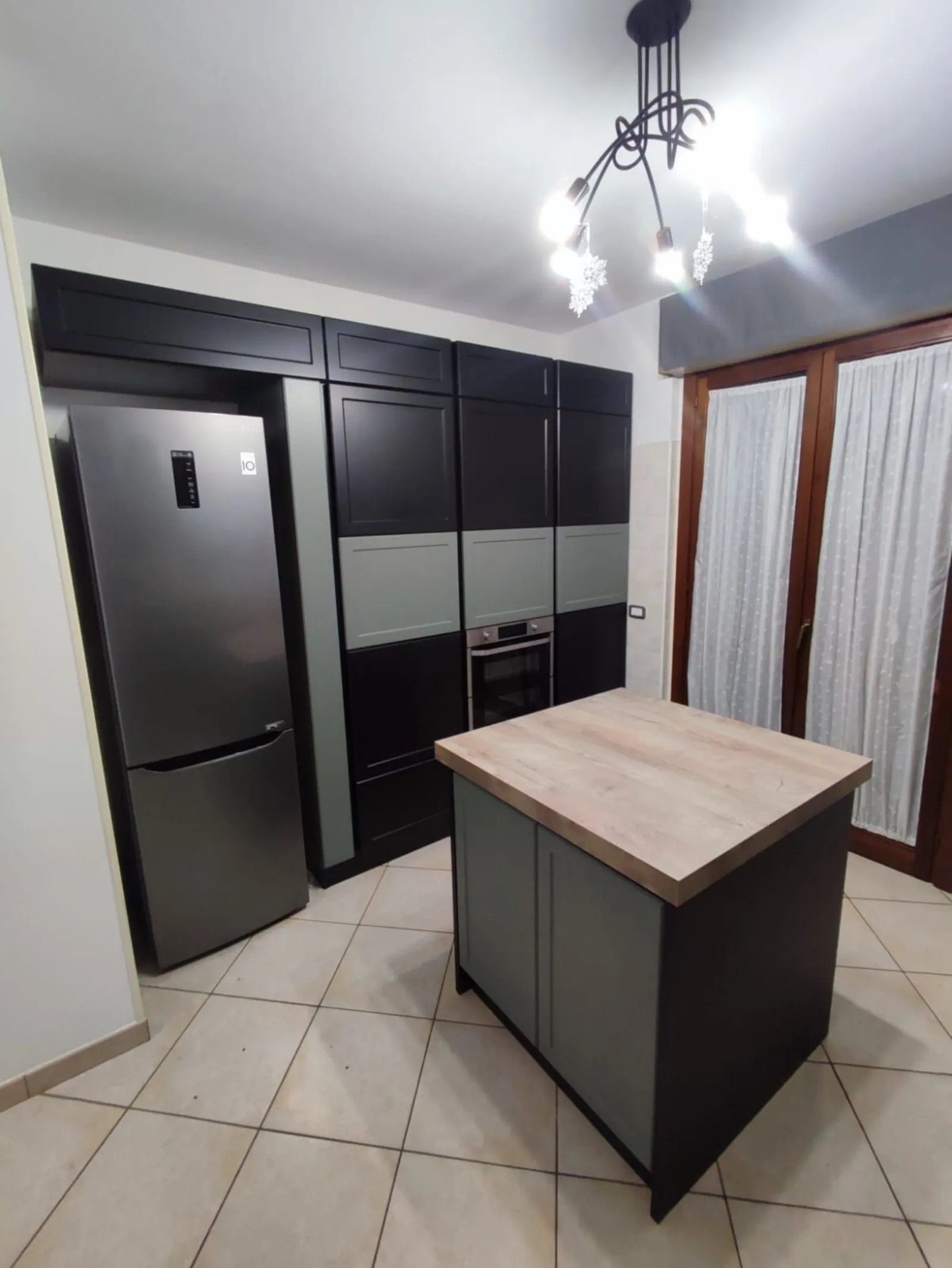 La scelta del verde e del nero per questa cucina non è casuale, ma il risultato di una profonda riflessione sull'impatto visivo e sensoriale dei colori. Il verde, in particolare nelle sue sfumature più profonde e terrose, evoca la natura, la serenità e un senso di freschezza rigenerante, creando un piacevole contrasto con la solidità del nero. Quest'ultimo, simbolo di eleganza e modernità, conferisce profondità e struttura all'ambiente, esaltando le linee pulite e i volumi della cucina. L'accostamento di questi due colori genera un dinamismo visivo che cattura l'attenzione, rendendo lo spazio sofisticato ma allo stesso tempo accogliente e vivace, perfetto per chi desidera un ambiente con carattere e stile distintivo.