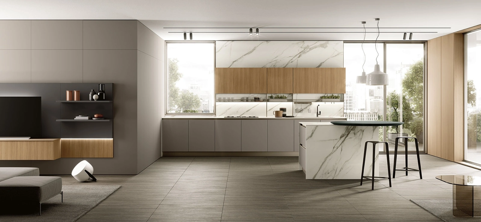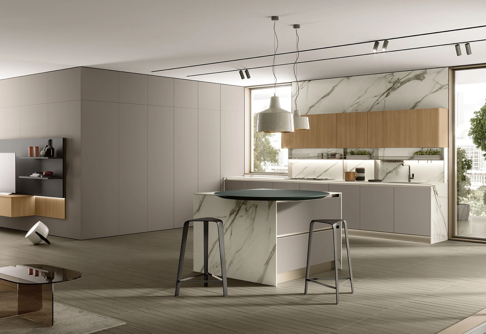 Clicca e scopri un universo di Cucine Moderne con isola: la cucina Segno 04 Colombini Kitchen in melaminico ti sta aspettando!