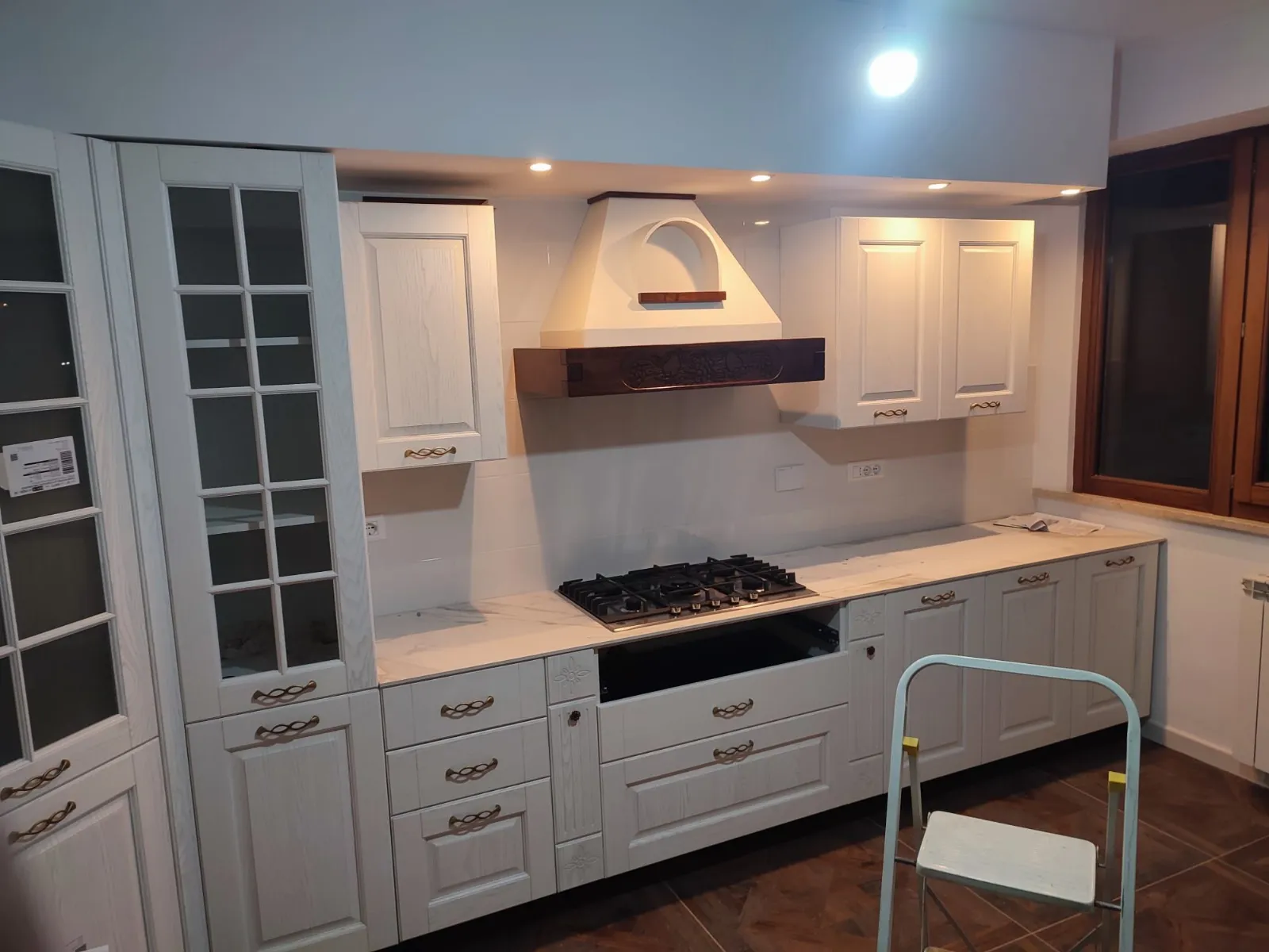 Oltre alla zona TV e libreria, il progetto include soluzioni integrate per la cucina, come la colonna frigo realizzata su misura per scomparire totalmente nel design della parete. La cappa a vista, elemento focale della zona cottura, è stata arricchita con decorazioni che richiamano lo stile della parete attrezzata, creando un dialogo tra le diverse aree funzionali. Questo approccio sartoriale permette di unificare gli ambienti, trasformando vincoli strutturali in punti di forza estetici e massimizzando l'efficienza degli spazi senza rinunciare all'eleganza del legno massello.
